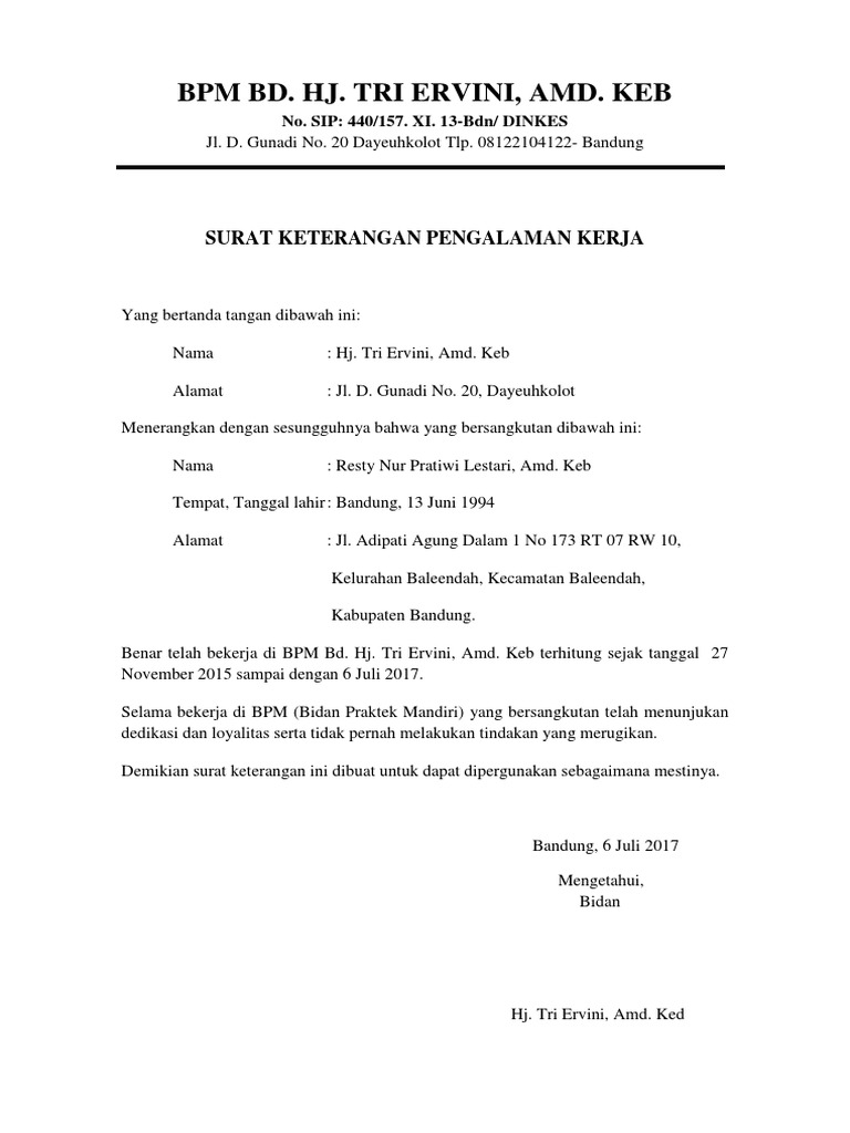 Setelah mempelajari format dan cara penulisan surat pengalaman kerja di atas, kamu bisa lanjutkan dengan melihat berbagai contoh jadinya di. Contoh surat lamaran kerja di perusahaan umum i. Contoh ini ditujukan untuk seorang manager. Pada hari ini, sabtu 25 februari 2017 banyak sekali dari sahabat pt.surya teknik anugerah inggin membuat pengalaman kerja semua unit yang di. Alhasil, surat tersebut bisa anda pergunakan. Bidan praktek mandiri (bpm) rani panjaitan jl. Sangat mudah juga jika kamu gambar diatas merupakan salah satu contoh surat lamaran kerja untuk melamar di perusahaan tambang. Contoh surat pengalaman kerja dari perusahaan √ administrasi √ bidan √ guru √ karyawan serta manfaatnya ada disini. Surat pengalaman kerja adalah sebuah teks surat yang diberikan pada karyawan setelah ia resmi berhenti dari suatu pekerjaan. Julian saputra, se jabatan : Contoh surat pengalaman kerja dan cara membuatnya secara sah. Surat pengalaman kerja ditulis bagi setiap pegawai yang telah selesai masa kerjanya, baik karena mengundurkan diri atau telah selesai memenuhi masa perjanjian kerja. Surat pengalaman kerja merupakan dokumen penting sebagai bukti calon pegawai yang hendak melamar pekerjaan.